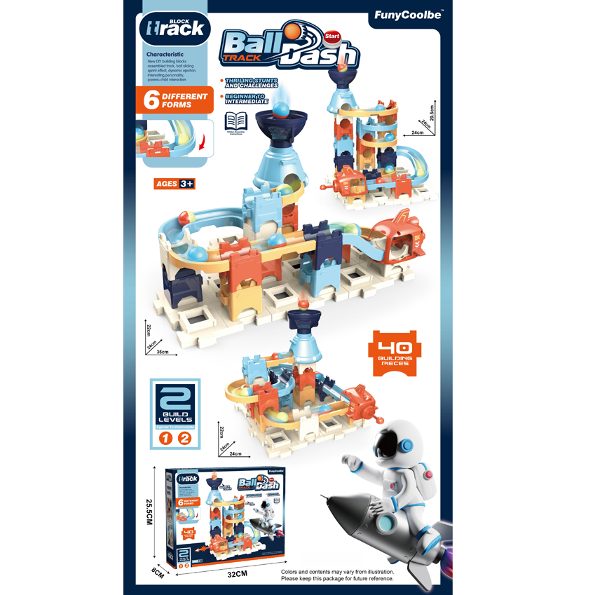 BESC: 40PCS DIY BUILDING BLOCK TRACK CATAPULT BALL-SPACE AGE INFO: 3+ PACKAGE: COLOR BOX PACKAGE SIZE: 32x8x25.5 PCS/CTN: 36 CARTON DIMENSION: 79.5x35x101 CBM: 0.281 MOQ: 180PCS CERTIFICATE: EN71、ASTM、10P、CPSIA、CPC、CE