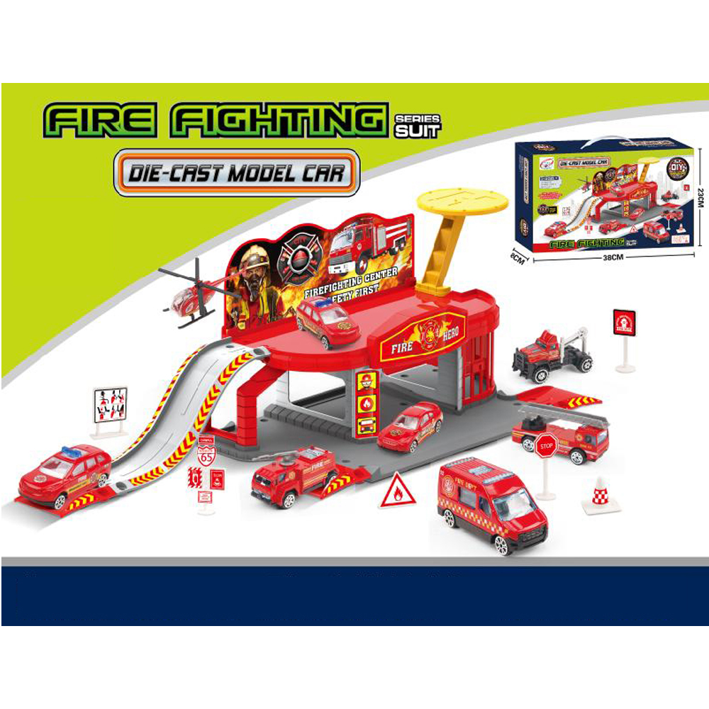 DESC:FIREENGINE PARKING LOT WITH DIE CAST CAR AGE INFO:3+ BATTERY INFO:/ PACKAGE:COLOR BOX PACKAGE SIZE:38*8*23 PCS/CTN:36 CARTON DIMENSION:73*40*103 CBM:0.301 MOQ:180PCS CERTIFICATE:BIS / EN71 / 10P / PAHS / CD / 3C/BSCI