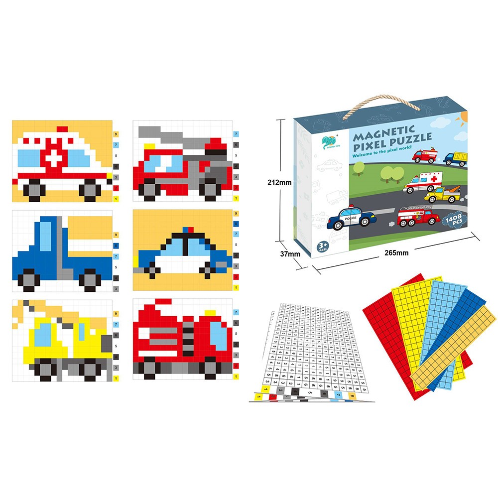 BESC:MAGNETIC PIXEL PUZZLES AGE INFO:3+ BATTERY INFO:/ PACKAGE:COLOR BOX PACKAGE SIZE:26.5×21.2×3.7 PCS/CTN:24 CARTON DIMNSION:66 28 33 CBM:2.15395488 MOQ:120PCS CERTIFICATE:ASTM,EN71-1-2-3,HR4040+CA65,PAHS,10P