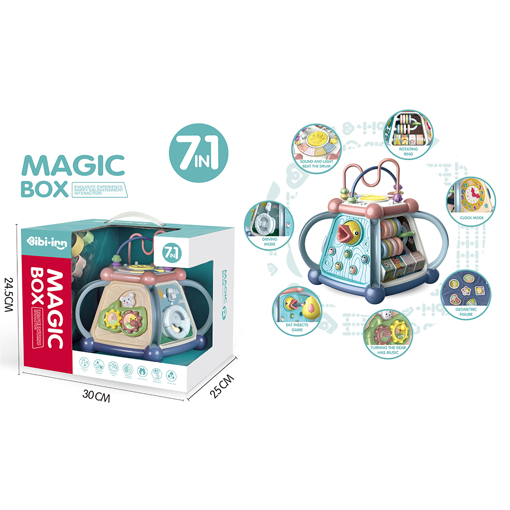 DESC:B/O 7 IN 1 BABY INTELLECTUAL MAGIC BOX AGE INFO:18M+ BATTERY INFO:3*AA NOT INCLUDED PACKAGE:WINDOW BOX PACKAGE SIZE:30*25*24.5 PCS/CTN:12 CARTON DIMENSION:78 52 66 CBM:0.2677 MOQ:60PCS CERTIFICATE:ASTM/HR4040/EN71/7P/EN62115/(CPC/CE)CERTIFICATE/ISO90/GCC