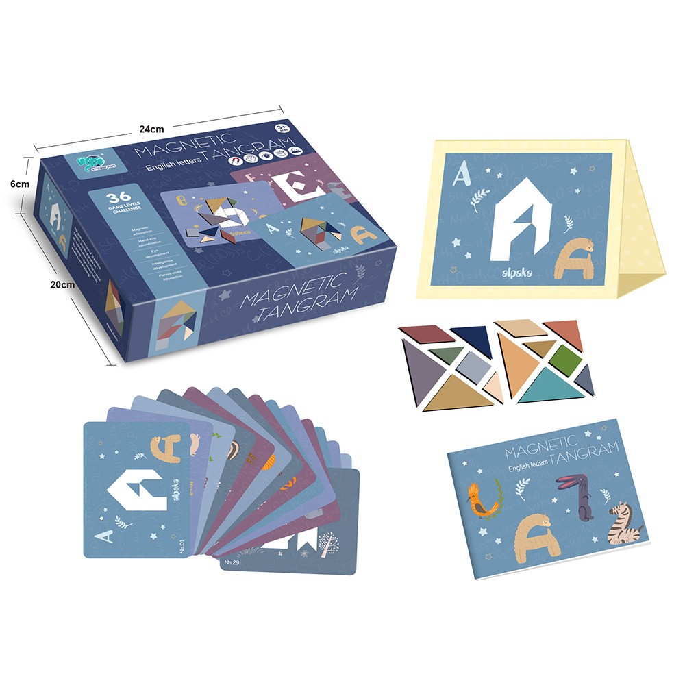 BESC:14PCS ALPHABET AND NUMBER TANGRAM MAGNETIC GAME AGE INFO:3+ BATTERY INFO:/ PACKAGE:COLOR BOX PACKAGE SIZE:24*20*6 PCS/CTN:36 CARTON DIMNSION:76 39 46 CBM:4.81567008 MOQ:180PCS CERTIFICATE:ASTM,EN71-1-2-3,HR4040+CA65,PAHS,10P