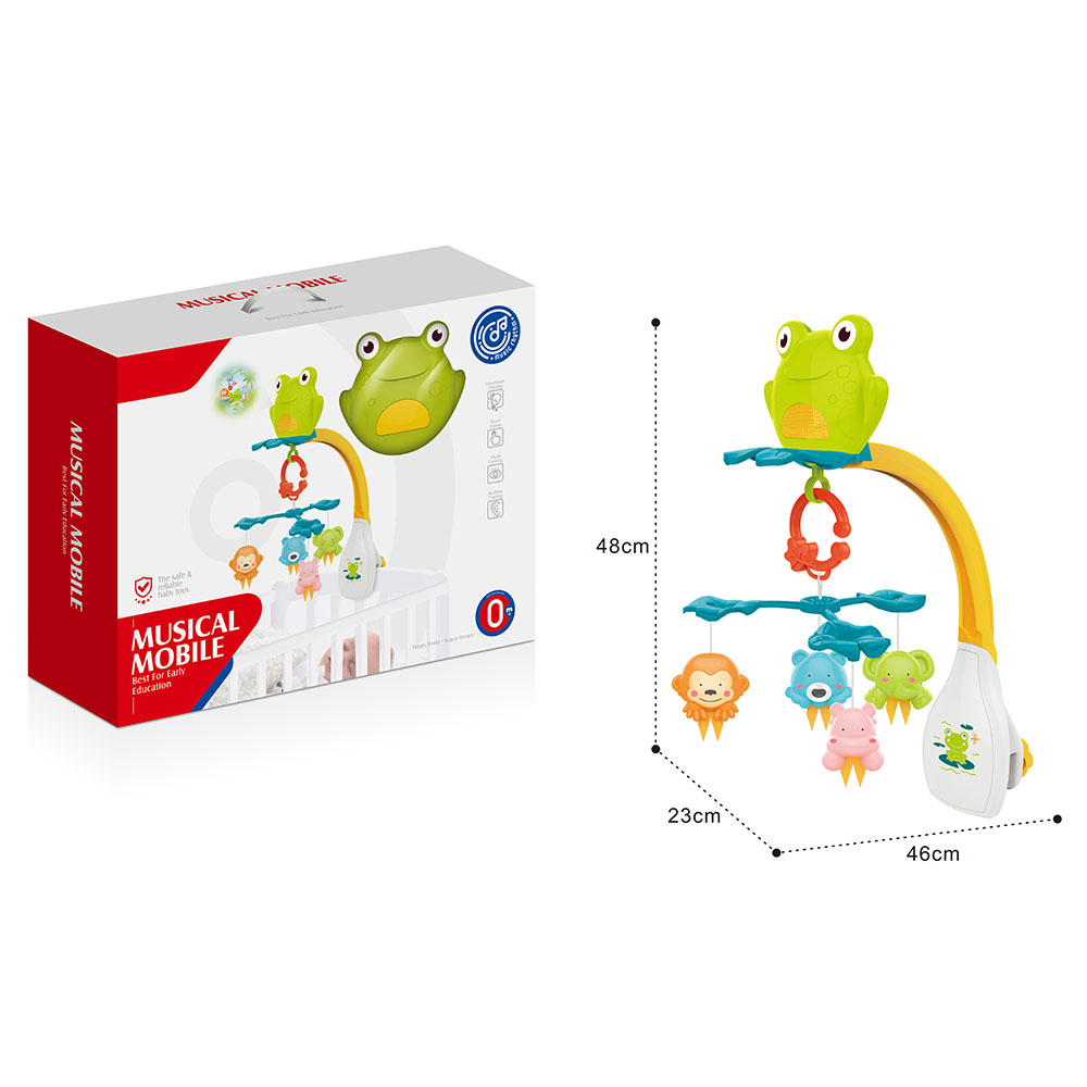 DESC:B/O FROG PROJECTION CRIB BELL WITH SOUND/LIGHT AGE INFO:0M+ BATTERY INFO:3*AAA INCLUDING PACKAGE:WINDOW BOX PACKAGE SIZE:42*11.2*32 PCS/CTN:6 CARTON DIMENSION:44*36*66 CBM:0.105 MOQ:30PCS CERTIFICATE:ASTM/HR4040/EN71/7P/EN62115/(CPC/CE)CERTIFICATE/ISO90/GCC