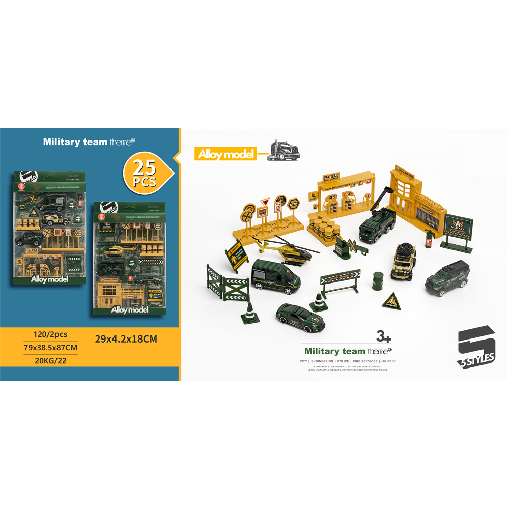 DESC:25 PCS MILITARY THEMED SERIES,WITH 3PCS DIECAST FREE WHEEL CAR,2 ASSORTED AGE INFO:3+ BATTERY INFO:/ PACKAGE:WINDOW BOX PACKAGE SIZE:29*4.2*18 PCS/CTN:120 CARTON DIMENSION:79 38.5 87 CBM:0.2646105 MOQ:600PCS CERTIFICATE:BIS / EN71 / 10P / PAHS / CD / 3C/BSCI