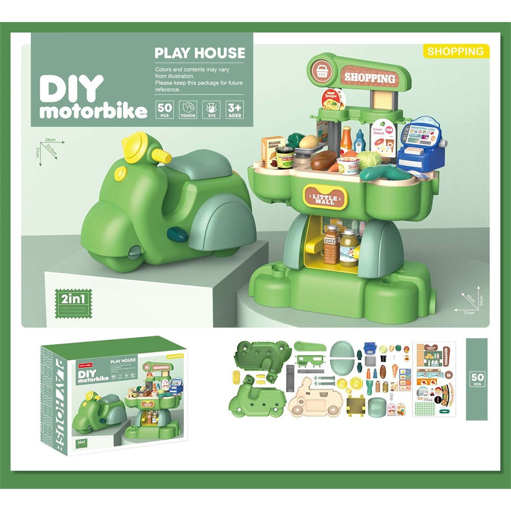 BESC:2 IN 1 MOTORBIKE-MINI SHOP AGE INFO:3+ BATTERY INFO:/ PACKAGE:COLOR BOX PACKAGE SIZE:40*32*14 PCS/CTN:18 CARTON DIMNSION:87 42 99 CBM:0.361746 MOQ:90PCS CERTIFICATE:EN71,10P,PAHS