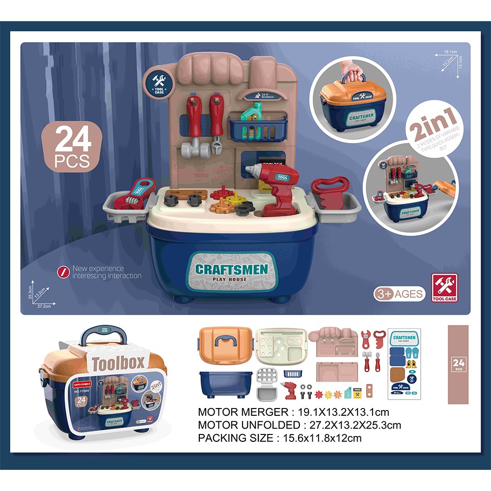 BESC:2 IN 1 HANDLE BOX-TOOL SET AGE INFO:3+ BATTERY INFO:/ PACKAGE:HANDLE BOX WITH PAPER CARD PACKAGE SIZE:19.1*13.2*13.1 PCS/CTN:96 CARTON DIMNSION:80 40 103 CBM:0.3296 MOQ:480PCS CERTIFICATE:EN71,10P,PAHS