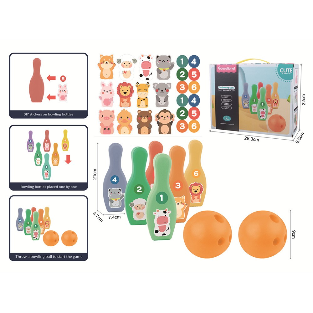 BESC:8 PCS INTELLECTUAL BABY BOWLING SET AGE INFO:6-36M BATTERY:/ PACKAGE:COLOR BOX PACKAGE SIZE:28.5*9.5*22 PCS/CTN:36 CARTON DIMENSION:87.5 40 68 CBM:0.238 MOQ:180PCS CERTIFICATE:EN71 10P EN62115 7P EN60825 ROHS ASTM CPSIA CPC
