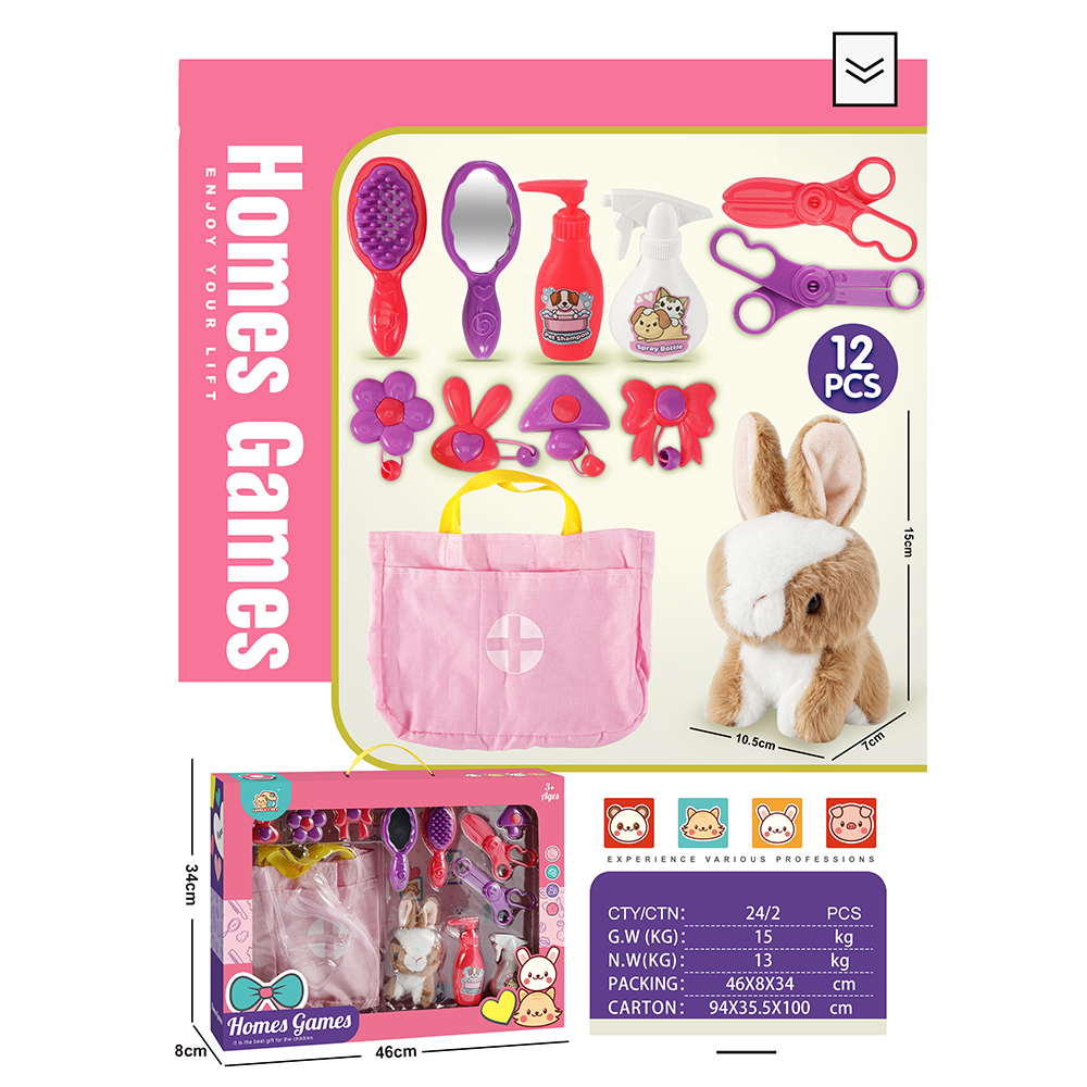 BESC:12 PCS STUFFED RABBIT-MAKE UP SET AGE INFO:3+ BATTERY INFO:/ PACKAGE:WINDOW BOX PACKAGE SIZE:46*34*8 PCS/CTN:24 CARTON DIMNSION:94 35.5 100 CBM:0.3337 MOQ:120PCS CERTIFICATE:EN71,ASTM,HR4040,10P,PAHS