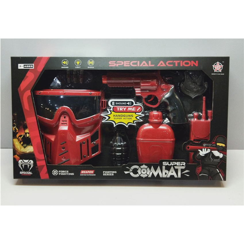 BESC:B/O WARRIOR GUN SET,WITH SOUND AGE INFO:3+ BATTERY:3*AG13 INCLUDED PACKAGE:WINDOW BOX PACKAGE SIZE:42*4.5*24 PCS/CTN:48 CARTON DIENSION:74*43.5*76 CBM:0.245 MOQ:240PCS CERTIFICATE:10P、CPC、HR4040、ASTM、CE、EN71、CD、PAHS、GCC
