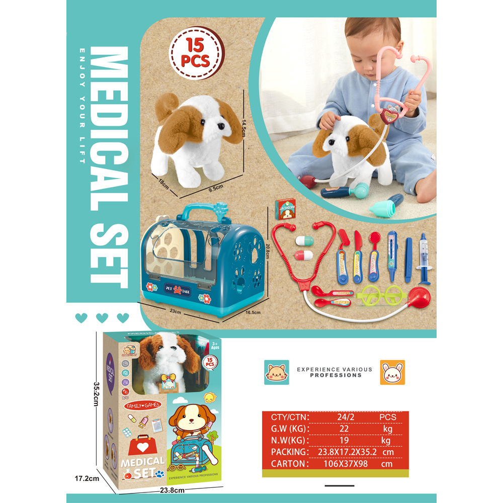 DESC:B/O 15 PCS STUFFED DOG-MEDICAL SET,CAN MOVE,WITH SOUND AGE INFO:3+ BATTERY INFO:2*AA NOT INCLUDED PACKAGE:WINDOW BOX PACKAGE SIZE:24*17.5*36 PCS/CTN:24 CARTON DIMENSION:106*37*98 CBM:0.384 MOQ:120PCS CERTIFICATE:ASTM/HR4040/EN71/7P/EN62115/(CPC/CE)CERTIFICATE/ISO90/GCC