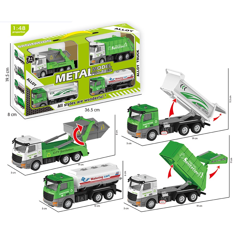 DESC:1:48 PULL BACK DIE CAST SANITATION TRUCK AGE INFO:3+ BATTERY INFO:/ PACKAGE:COLOR BOX PACKAGE SIZE:36.5*8*19.5 PCS/CTN:24 CARTON DIMENSION:61*40*72 CBM:0.176 MOQ:120PCS CERTIFICATE:BIS / EN71 / 10P / PAHS / CD / 3C/BSCI