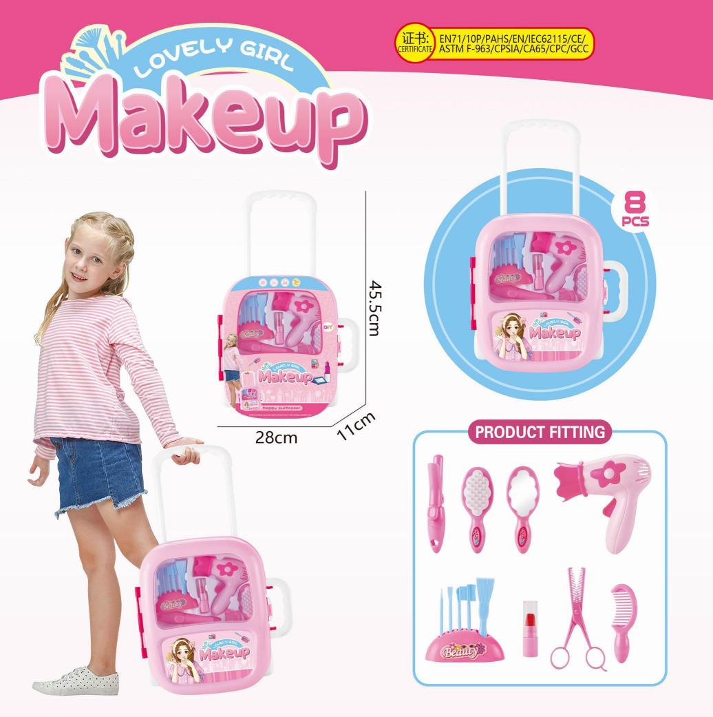 DESC:COSMETICS SET AGE INFO: 3+ BATTERY INFO:/ PACKAGE: PLASTIC BOX WITH PAPER CARD PACKAGE SIZE: 28×11×45.5 PCS/CTN: 36 CARTON DIMENSION:83*49*65 CBM: 0.264 MOQ: 180 PCS CERTIFICATE: EN71,10P,PAHS,EN,IEC62115,CE,ASTM F-963,CPSIA,CA65,CPC,GCC