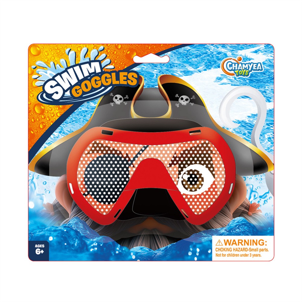 DESC: BIG SWIMMING GOGGLES-PIRATE AGE INFO: 6+ BATTERY INFO: / PACKAGE: BLISTER CARD PACKAGE SIZE: 21.5×6.5×19 PCS/CTN: 144 CARTON DIMENSION: 66*42.5*84 CBM: 0.236 MOQ: 720 PCS CERTIFICATE: EN71/PAHS/CPC/ASTM/HR4040