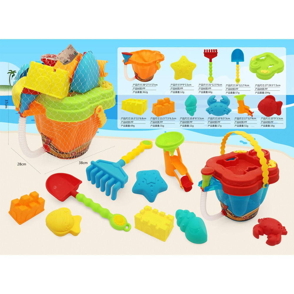 BESC:12 PCS BEACH TOYS-BUCKET,2 ASSORTED AGE INFO:3+ BATTERY:/ PACKAGE:NET BAG PACKAGE SIZE:37*36*22 PCS/CTN:12 CARTON DIMNSION:96.5 53 78 CBM:0.398931 MOQ:60PCS CERTIFICATE:EN71、10P、ASTM、HR4040